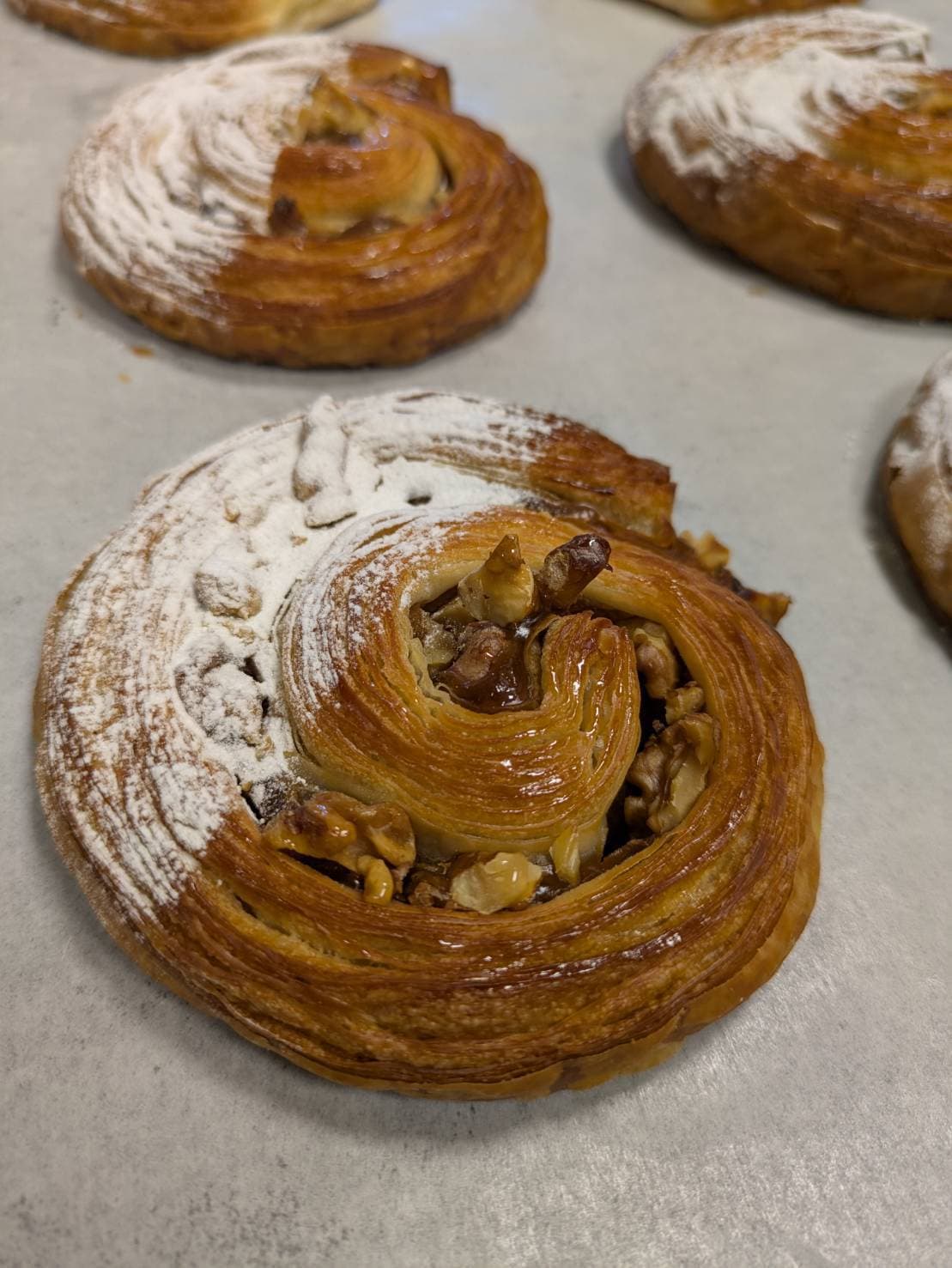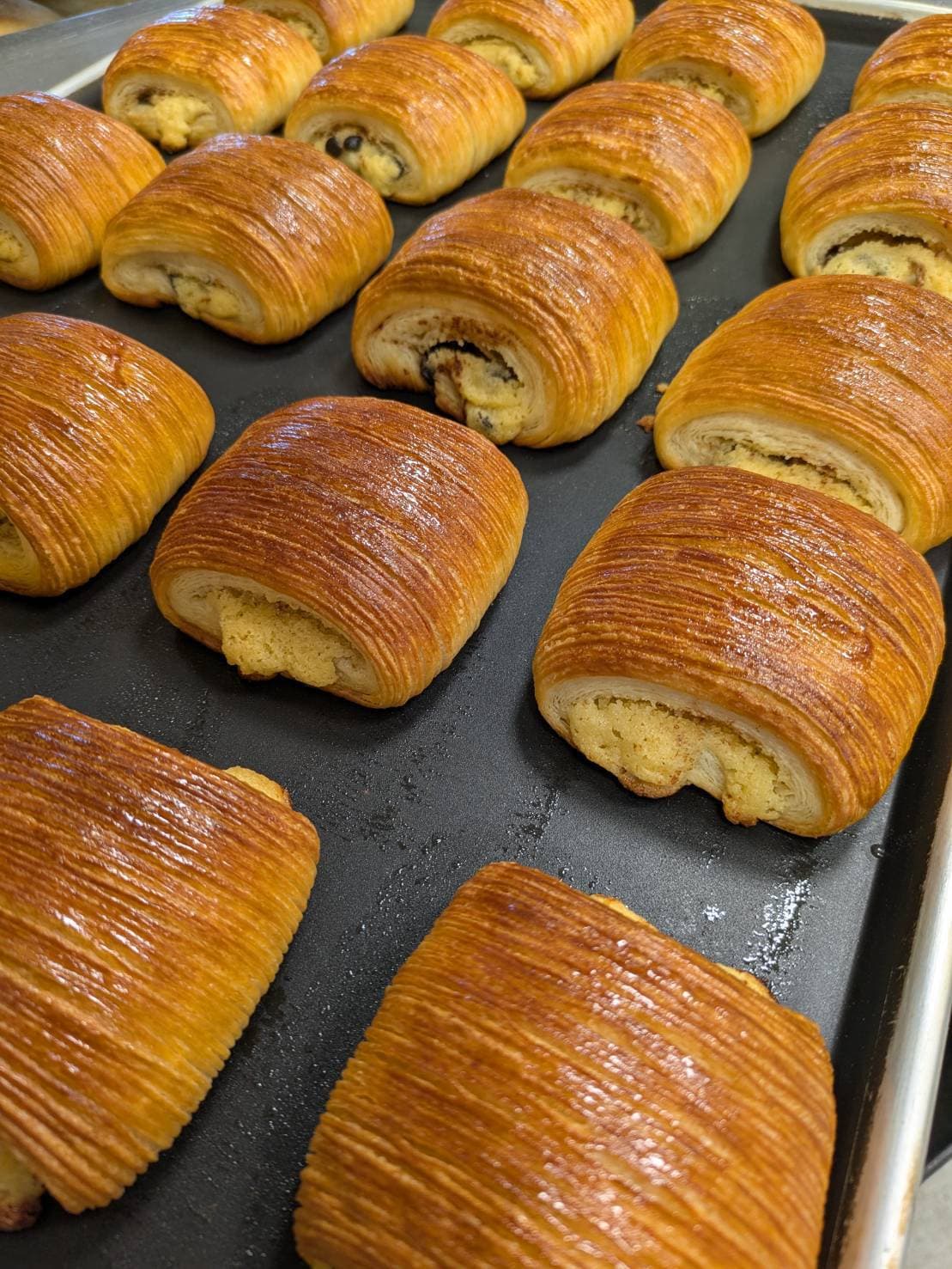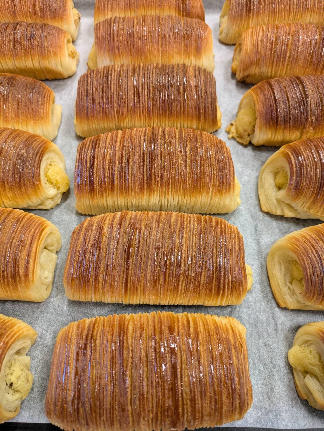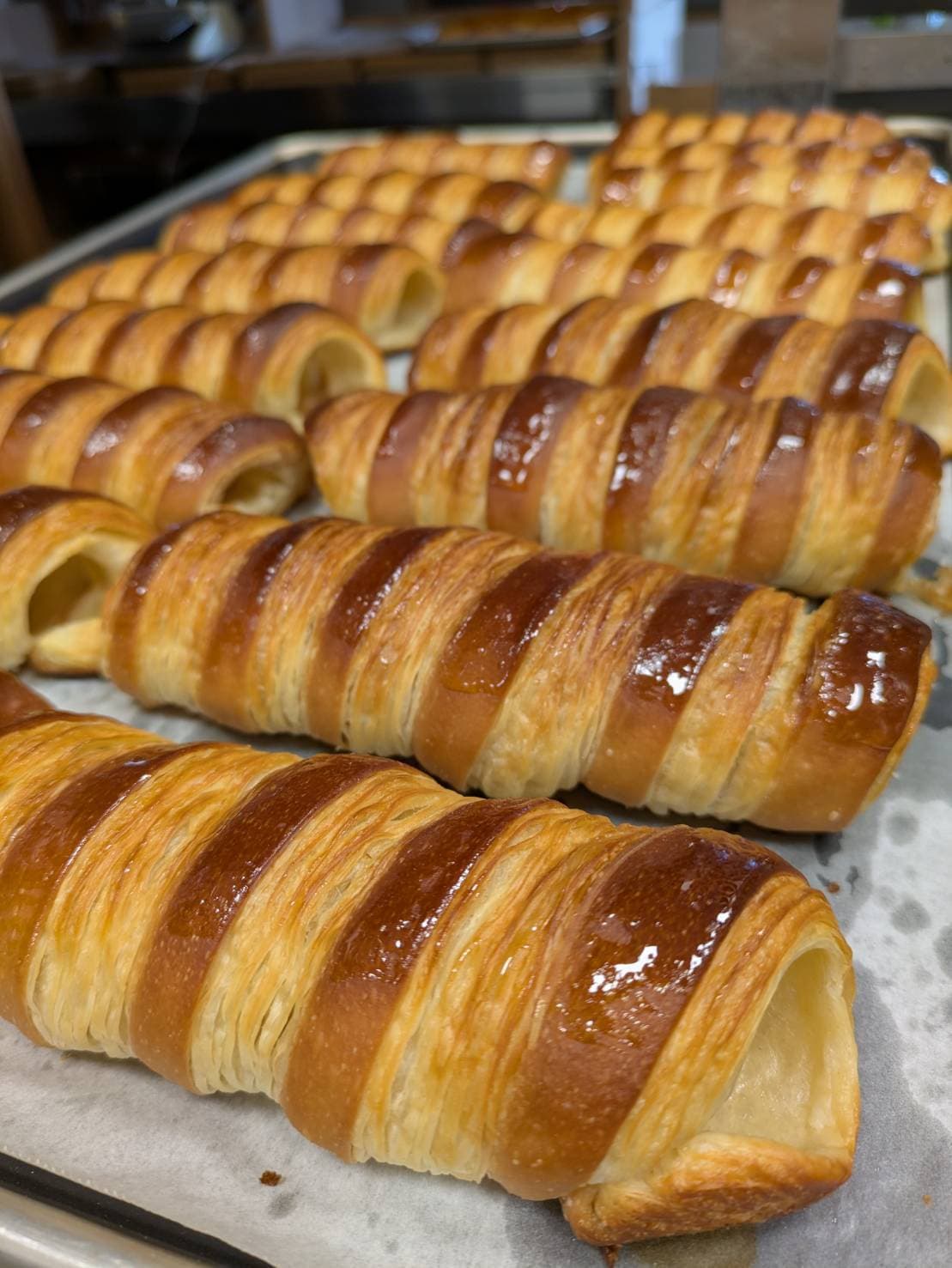 原料として、小麦、イースト、牛乳、卵、多量のバターを含むデンマーク由来のパンです。パン生地を薄く延ばし、バターを塗り込み何重にも重ね、巻き込むことを数回繰り返すことでサクサクする食感やバターの風味ができ上がります。